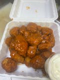 Breaded chicken breast dipped in BBQ sauce, Nacho cheese.